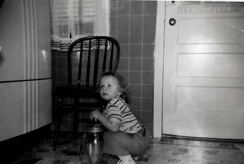 Nancy in the kitchen at the home place, playing with the butter churn